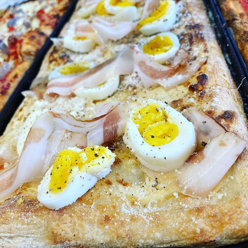 - Pizza al taglio - Carbonara; Pizza blanche, crème de Parmesan, œufs mollets, guanciale et poivre noir.
